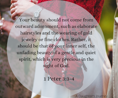 "Your beauty should not come from outward adornment, such as elaborate hairstyles and the wearing of gold jewelry or fine clothes. Rather, it should be that of your inner self, the unfading beauty of a gentle and quiet spirit, which is very precious in the sight of God."-1 Peter 3:3-4.